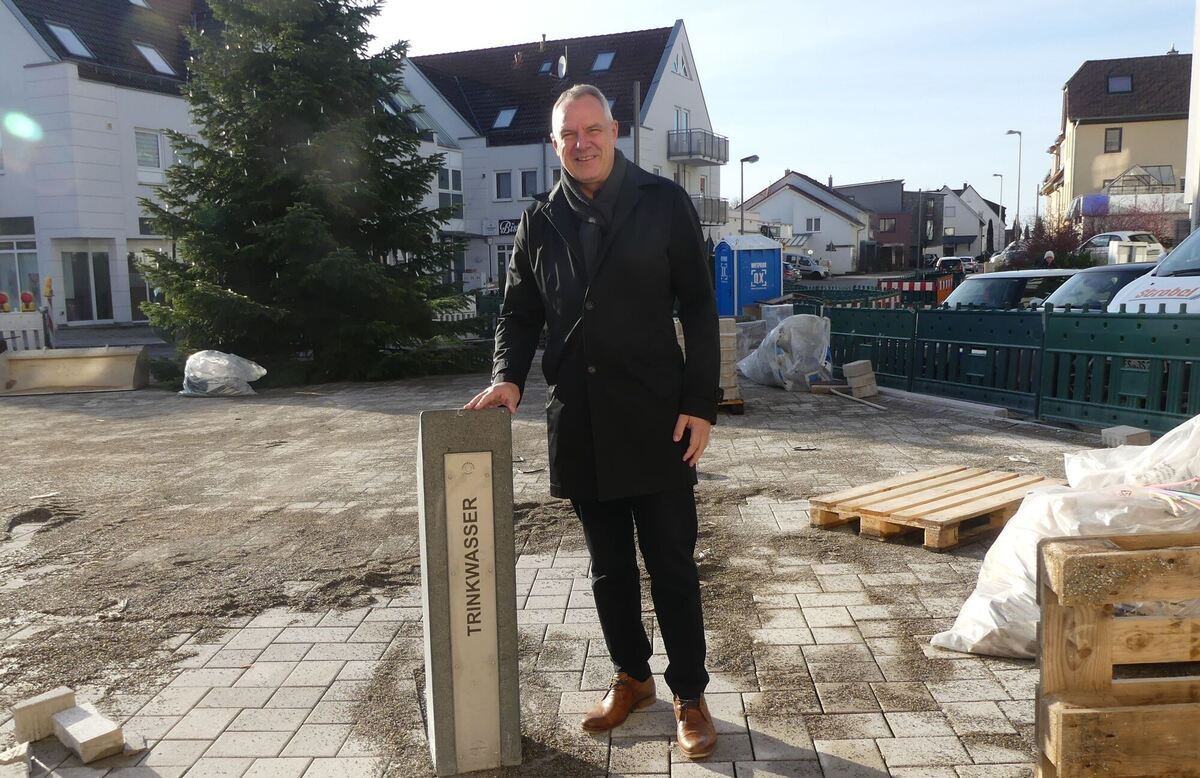 Aus dem neuen Trinkwasserbrunnen sprudelt zwar kein Geld und auch noch kein Wasser, aber er ist ein Hinweis auf die Sanierung der Ortsmitte. FOTO: SANDER