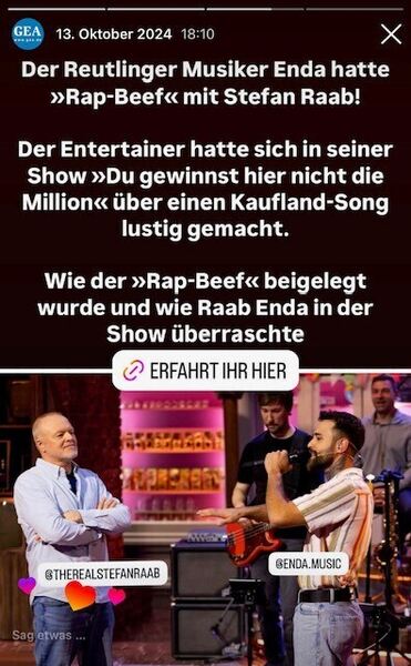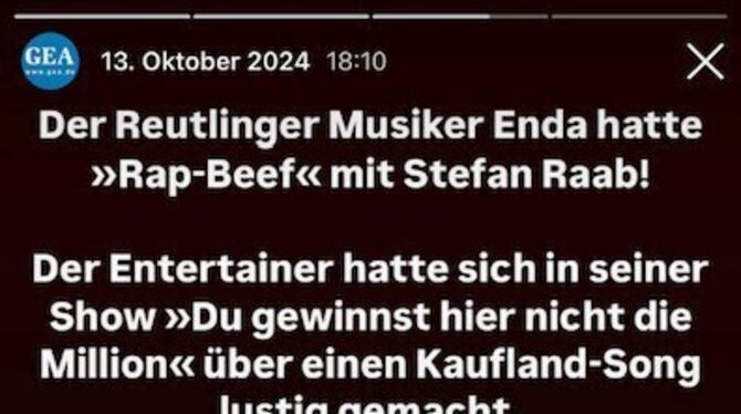 In den Insta-Storys des GEA bekommen die Nutzer aktuelle Neuigkeiten aus Reutlingen und der Region. Besonders interessiert hat dabei offensichtlich der »Rap-Beef« zwischen dem Reutlinger Musiker Enda und Entertainer Stefan Raab. 20.465 Mal wurde die Story vom 13. Oktober 2024 aufgerufen.