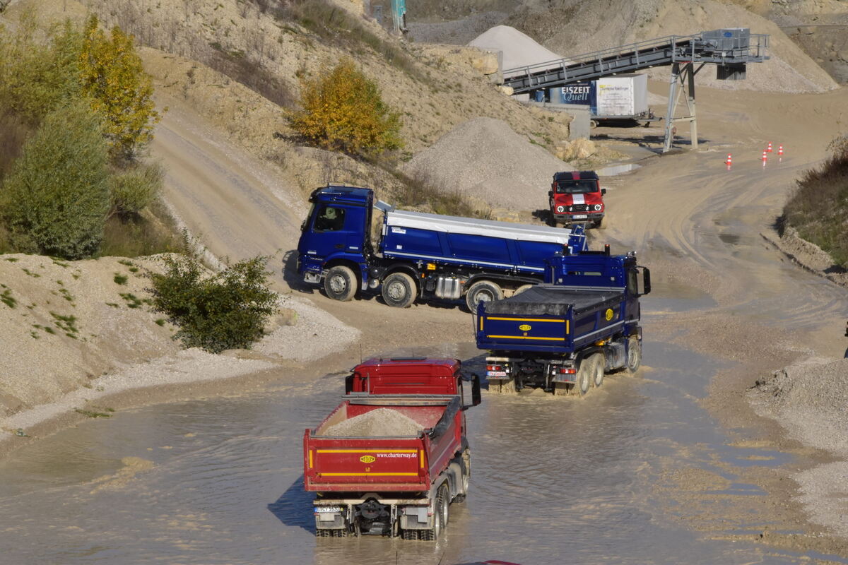 Neben lokalen Bauunternehmen, die in spektakulärer Kulisse rund 35 Fahrzeuge und Maschinen präsentieren konnten, war ein Dutzend Neu-Lkws von Herstellern auf der Piste durch den Steinbruch unterwegs. Die anspruchsvolle Strecke führte über Steilhänge, erschwerte Schotterabschnitte und durch weite Wasserflächen. Assistiert von Experten, konnten Lkw-Fahrer auch von Feuerwehr und THW den Traum aus Sandkasten-Tagen wahr werden lassen. »Die meisten Teilnehmer fahren beruflich nur auf der Autobahn. Für die war das ein völlig neues Erlebnis«, so Mitorganisator Rainer Schott. (GEA)