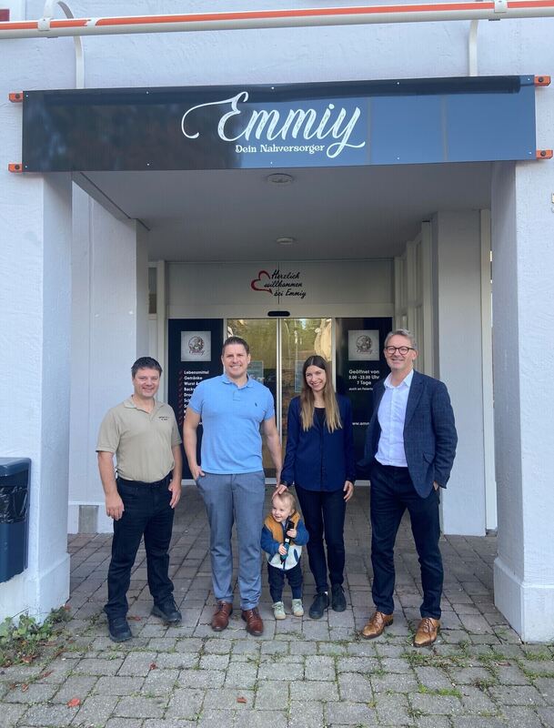Florian und Janine Bächle (in der Mitte) haben am Freitag eine Filiale ihrer Nahversorger-Kette Emmiy in Öschingen eröffnet. Unterstützung bekommen sie von ihren Verpächtern der Kreisbaugesellschaft Tübingen, für die Geschäftsführer Matthias Sacher (rechts) und Meik Hilpert zu Besuch waren.