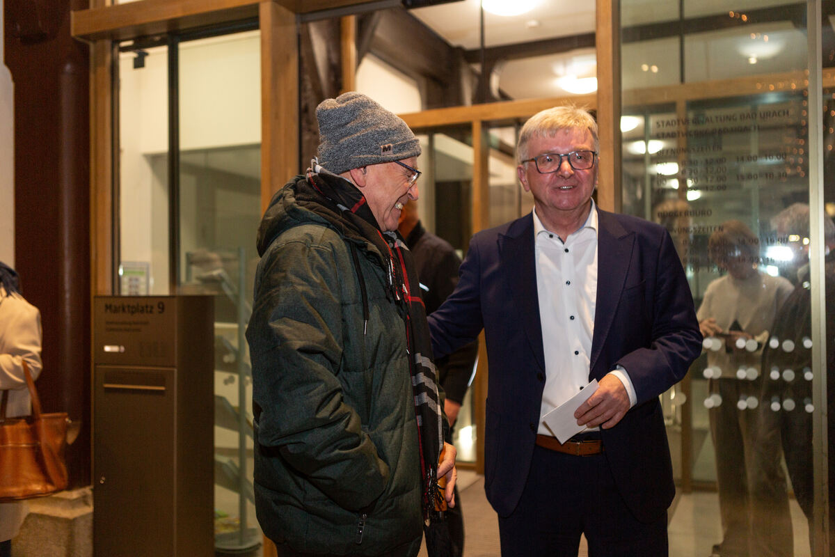 Des einen Freud, des anderen Leid: Hermann Kiefer (links) vom »Bürgerforum« Hengen neben Elmar Rebmann kurz nachdem der Rathaus-Chef das Ergebnis des Bürgerentscheids bekanntgegeben hat.