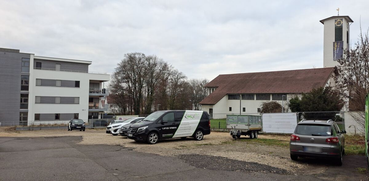 Auf der Brachfläche in der Nürtinger Straße 95 möchte die Nestbau AG ihr Bürgerwohnprojekt verwirklichen. Rechts die Friedenskirche.