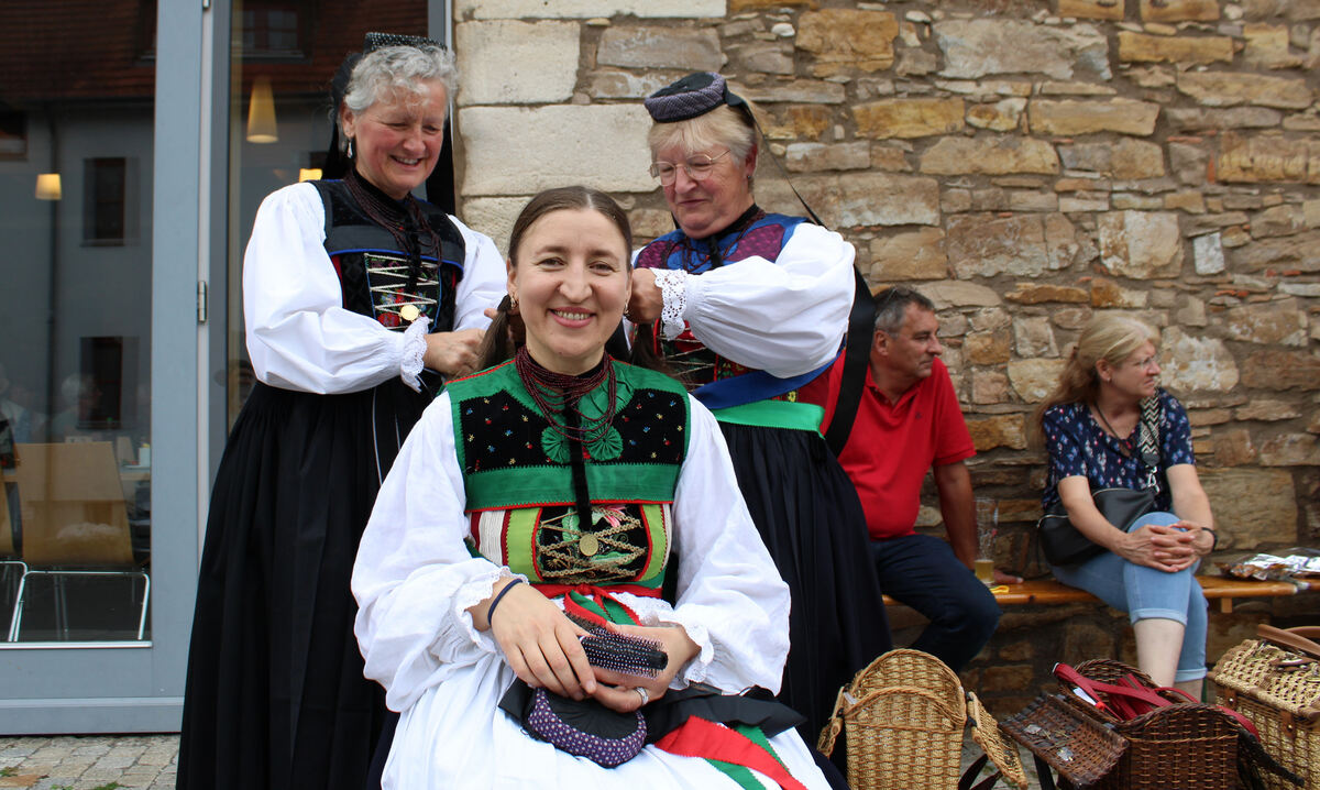 Viele Hände sind nötig, um Betzinger Tracht und Haarschmuck anzulegen.