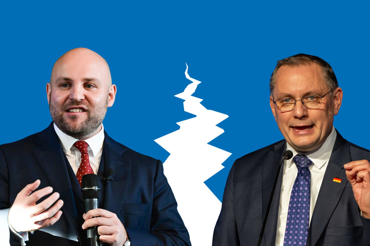 Markus Frohnmaier, der AfD-Spitzenkandidat für die Landtagswahl ist Trump-Fan, Parteichef Tino Chrupalla äußert vorsichtige Kritik. FOTOS: OBERSTEIN; WEISSBROD/DPA; MONTAGE: GEA