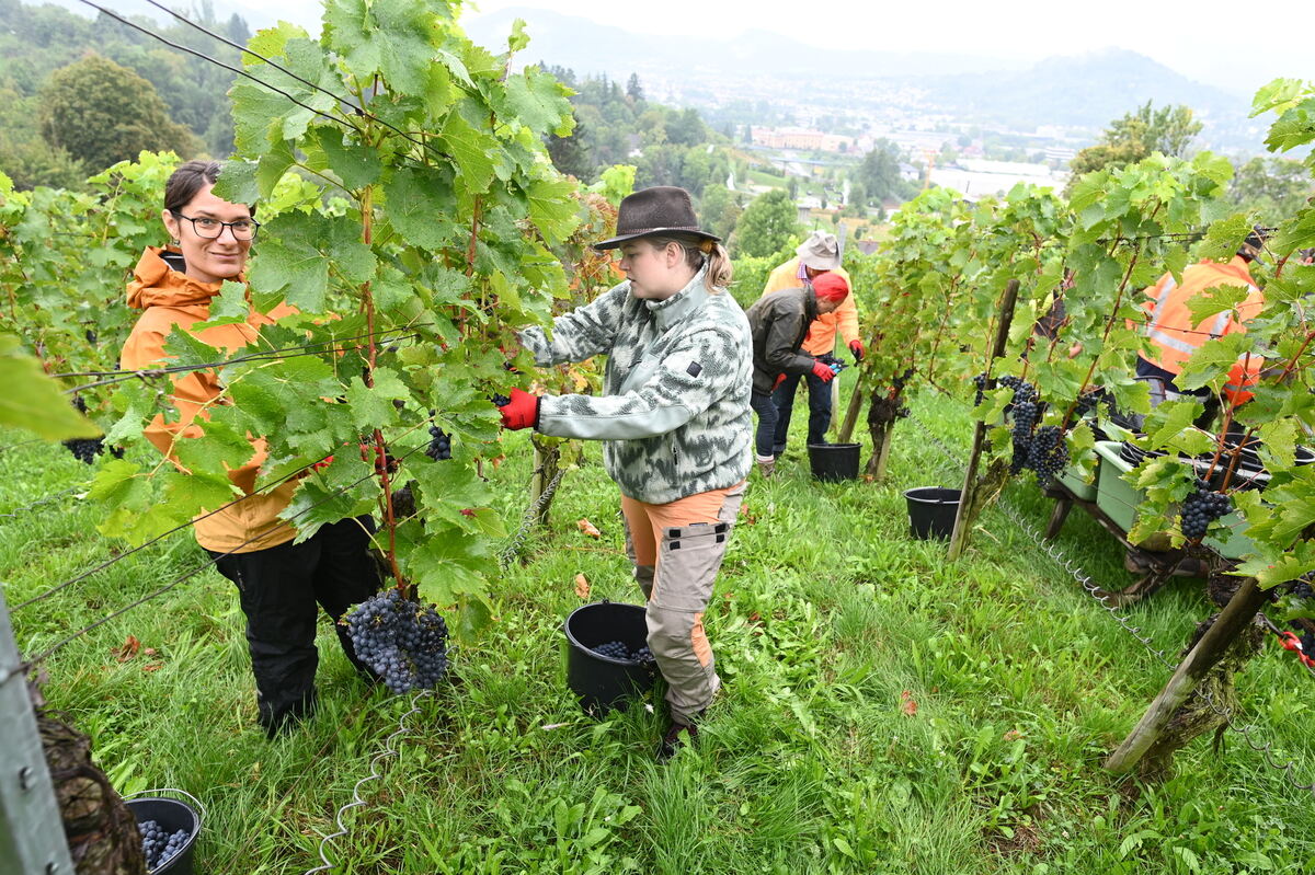 Gemeinderäte trotzen bei der Lese im städtischen Weinberg dem Regen.