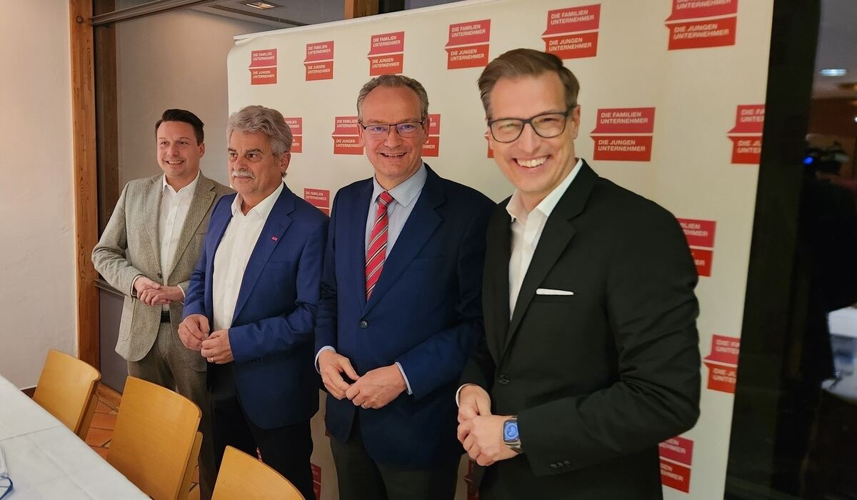 Staatsminister Gunter Krichbaum (2. von rechts) bei den Jung- und Familienunternehmern auf der Achalm. Links Landtagsabgeordneter Manuel Hailfinger, neben ihm Moderator Rainer Knauer und ganz rechts Robin Morgenstern, der neue Vorsitzende des Wirtschaftsverbandes der Familienunternehmer in Baden-Württemberg.