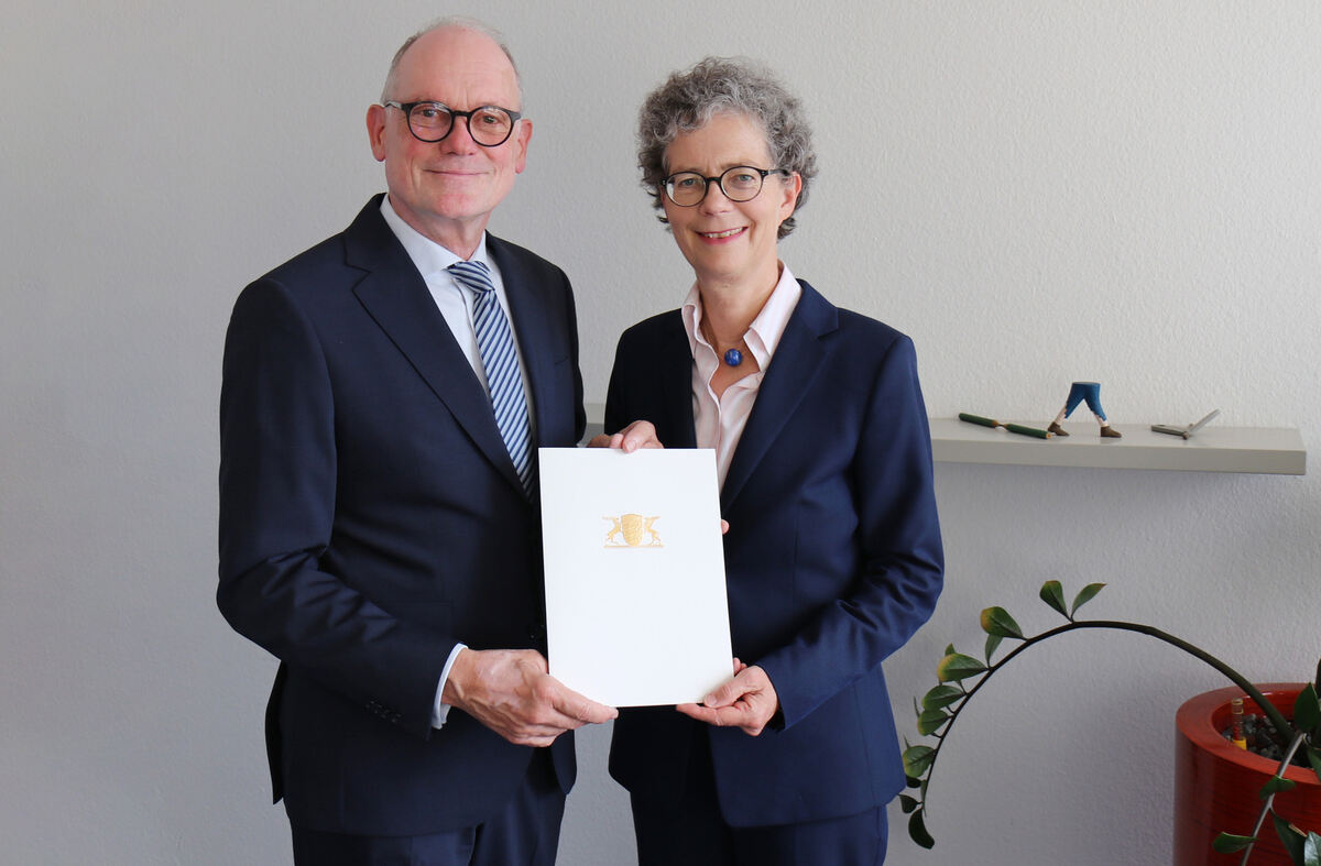 REUTLINGEN. Seit dem 1. September steht die Hochschule Reutlingen unter neuer Leitung: Professorin Dr. Sabine Löbbe hat offiziell das Amt der Präsidentin übernommen. Bereits im April 2025 hatten Senat und Hochschulrat sie gewählt. Ihre offizielle Ernennungsurkunde erhielt Sabine Löbbe von Ministerialdirektor Dr. Hans J. Reiter und Ministerialrat Dr. Volker Wedekind, beide vom Ministerium für Wissenschaft, Forschung und Kunst Baden-Württemberg.