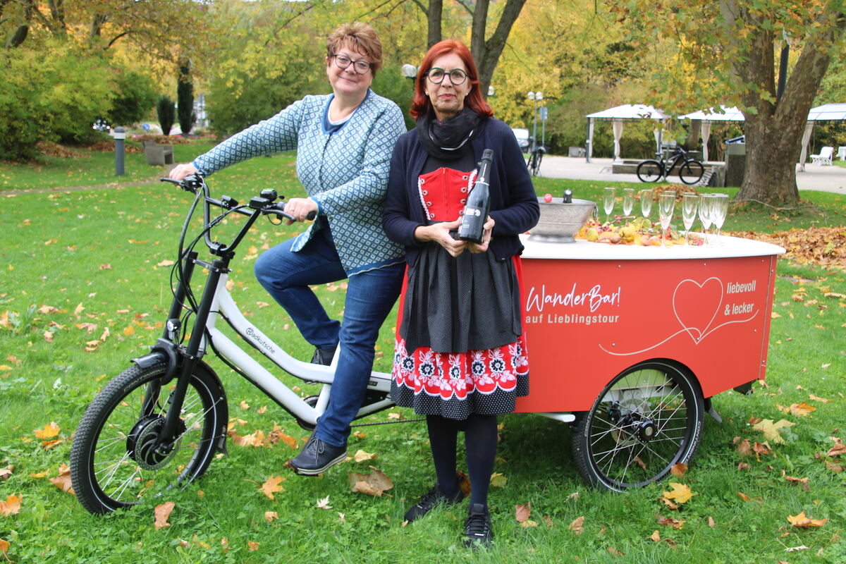 Kathrin Steinhart (links) und Regine Erb werden künftig mit ihrer mobilen Theke auf Tour sein, um den Menschen die Schönheit der Schwäbischen Alb nahe zu bringen