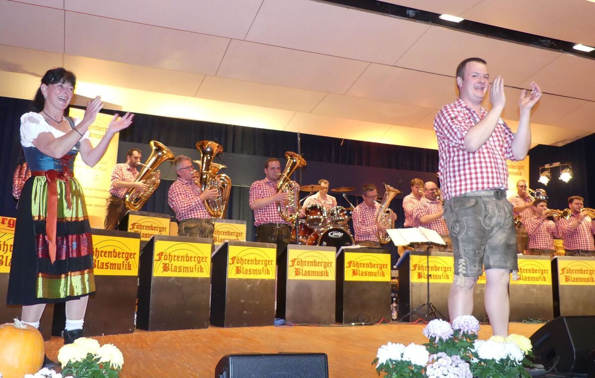 Dirigent Toni Hinderer wandte sich auch dem Publikum zu und förderte damit die gute Stimmung in der Gutenberghalle. FOTO: SANDER