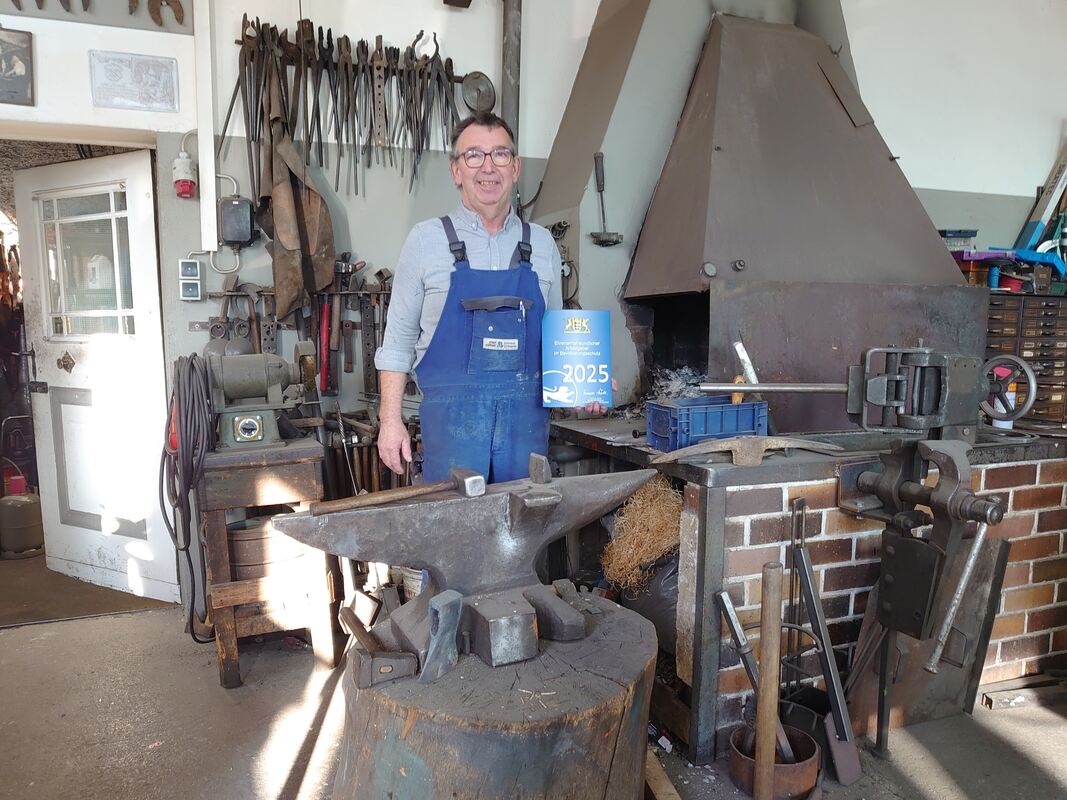 Josef Leippert mit der Plakette des Innenministers vor Amboss und Esse.