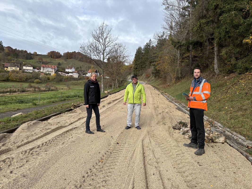 Tobias Halm, Marcus Friedrich und Corinna Himming (von rechts) begutachten die Felsräumungsmaßnahmen in Gundelfingen.