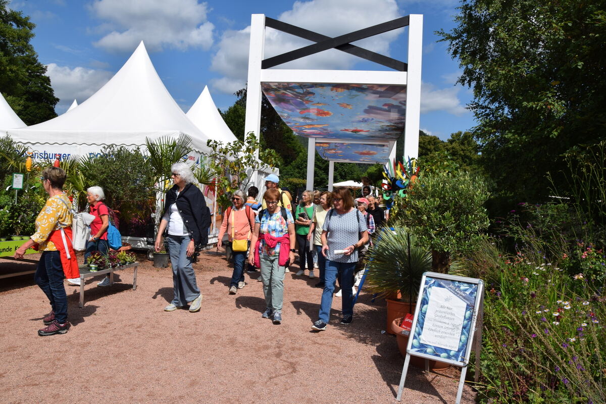 Zurück im eigentlichen Gartenschaugelände kamen die Pflanzenfreundinnen und -freunde im Musterschrebergarten und anderen Schaugärten auf ihre Kosten. Dann machten sich die Teilnehmenden nach eigener Lust und Laune auf den Weg – zunächst zu den gastronomischen Angeboten und mit dem Shuttle zu weiter entfernten Zielen beispielsweise im Baiersbronner Teilort Friedrichstal, wo es das industriegeschichtliche Museum Hammerschmiede und die idyllisch am Hang gelegene Michaelskirche zu besuchen gibt. Wer nicht eingekehrt war, musste auf dem Rückweg entlang am Forbach kurz den Schirm aufspannen. Wie an den munteren Unterhaltungen auf der Rückfahrt zu hören war, gab es einige Eindrücke, über die sich die Mitreisenden auf dem Heimweg austauschen konnten. (GEA)