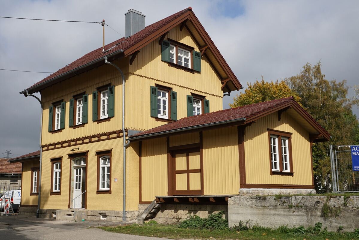 Der 1893 erbaute Bahnhof Gomadingen erstrahlt jetzt wieder in den Originalfarben. FOTO: LENK