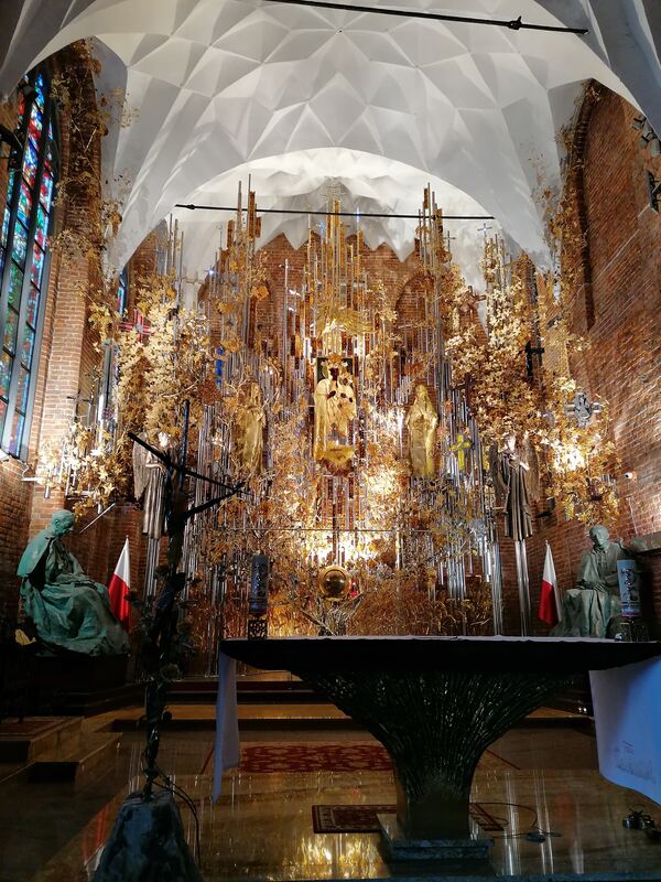 Der weltgrößte Bernsteinaltar Jankowskis mit polnischen Fahnen. FOTOS: ZIMMERMANN