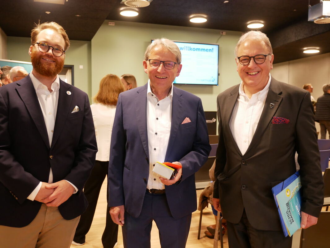 Schulleiter David Zadick (von links), Schulträger-Gründer Dr. Christian Engel und OB Thomas Keck feierten am Mittwoch den Neubau der ProGenius-Schule in der Mittnachtstraße.