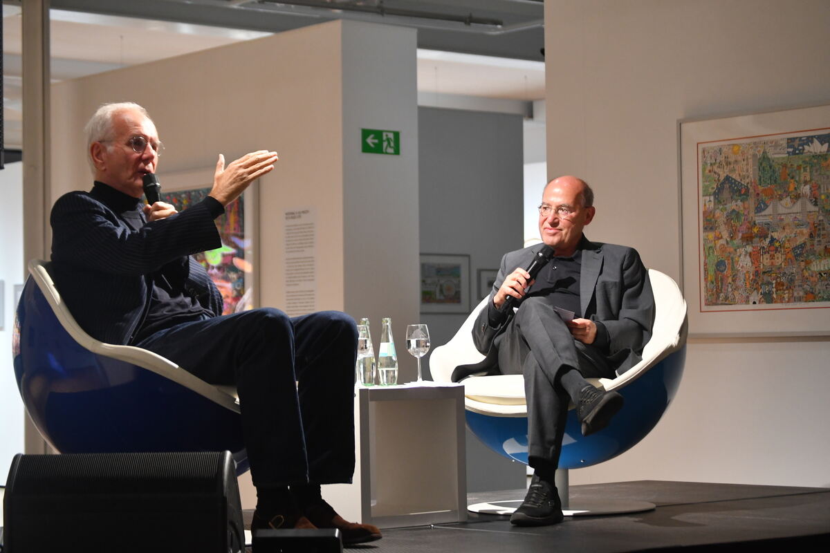 Harald Schmidt (links) und Gregor Gysi (Die Linke) im Gespräch vor ausverkauftem Saal im Kunstmuseum NKT. FOTO: SCHERTLIN