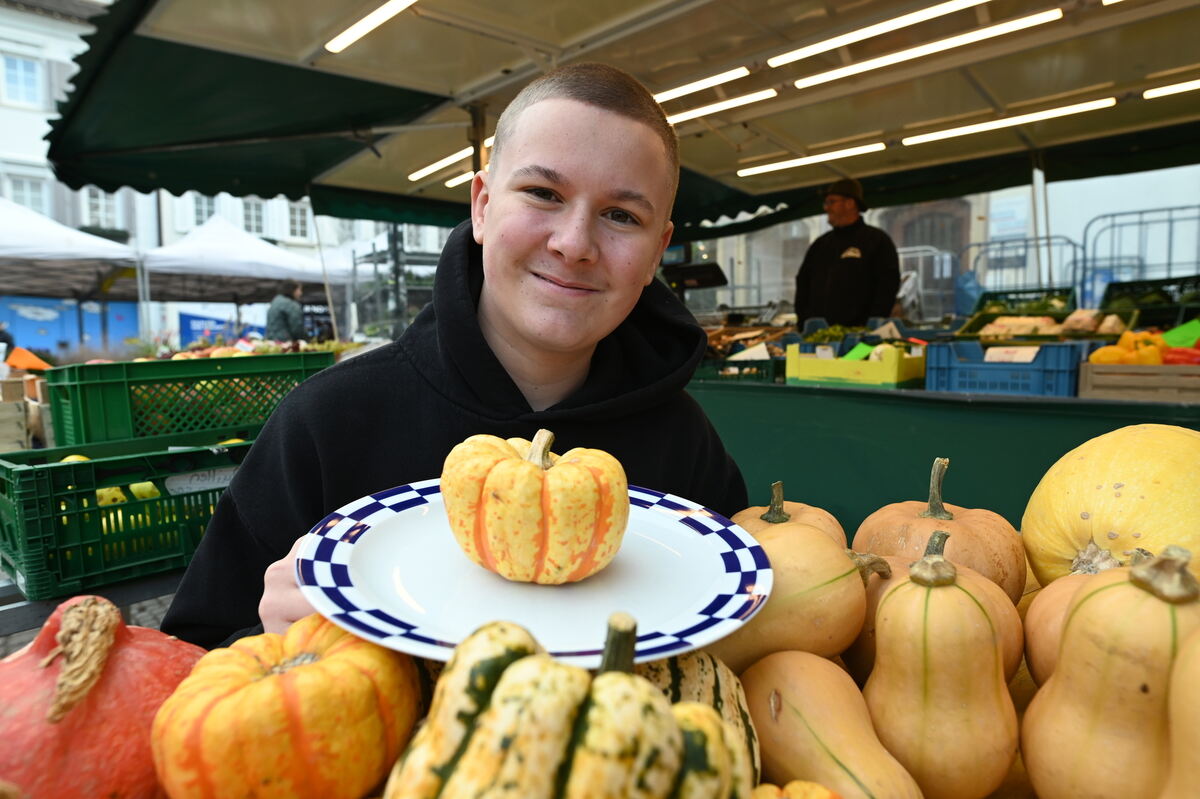 Früh übt sich, was später mal ein Agrar-Ingenieur werden will: Hannes Frech (14) kennt sich mit Kürbissen aus. Auf dem Reutlinger Wochenmarkt verkauft er am Stand seiner Eltern herbstfarbene Wonneproppen aus Sickenhäuser Anbau.