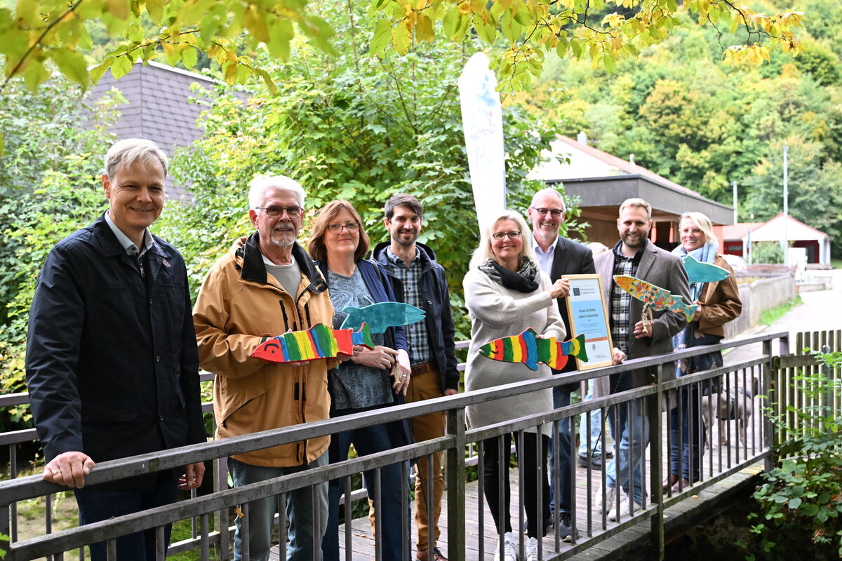 Lichtensteins Bürgermeister Peter Nußbaum (von links) freut sich gemeinsam mit den Künstlern Peter Häußler und Sabine Heid, Hannes Barthold von Leader, Hauptamtsleiterin Beatrice Herrmann, Ortsvorsteher Wilfried Schneider, Kai Bitz und Claudia Will von der Rathausverwaltung darüber, dass in Honau am Wochenende die Kunst im Mittelpunkt steht.