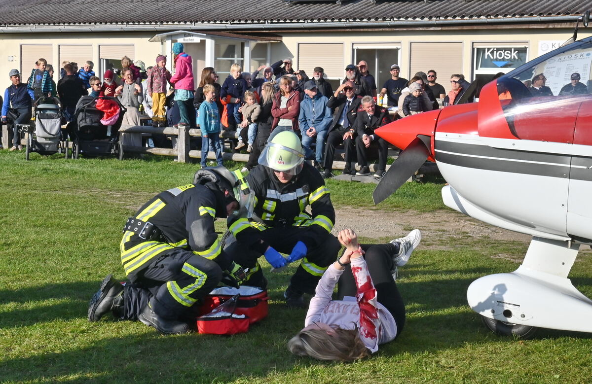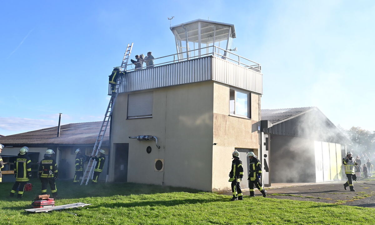 Herausfordernd waren die Folgen einer fiktiv brennenden Flughalle auf dem nur durch eine schmale Einbahnstraße erreichbaren 820 Meter hohen Hausberg für alle Beteiligten. Goldenes Oktober-Wetter kam den rund 200 Zuschauern entgegen, viele wanderten sogar hinauf. Die Zu- und Abfahrten, der Segelflugbetrieb und der Besucheransturm mussten geregelt, die Einsatz-Trupps der vier Abteilungen Stadtmitte, Talheim, Öschingen und Belsen koordiniert werden. Mehrere Szenarien der einstündigen Übung liefen parallel: Retten von vier durch Feuer abgeschnittenen Personen aus dem Tower. Verhindern des Ausbreitens der Flammen. Dazu, durch Kunstnebel in Szene gesetzt, der Zusammenstoß eines Schlepperfahrzeugs mit einem Motorflieger, mit fünf Verletzten. (mey)
