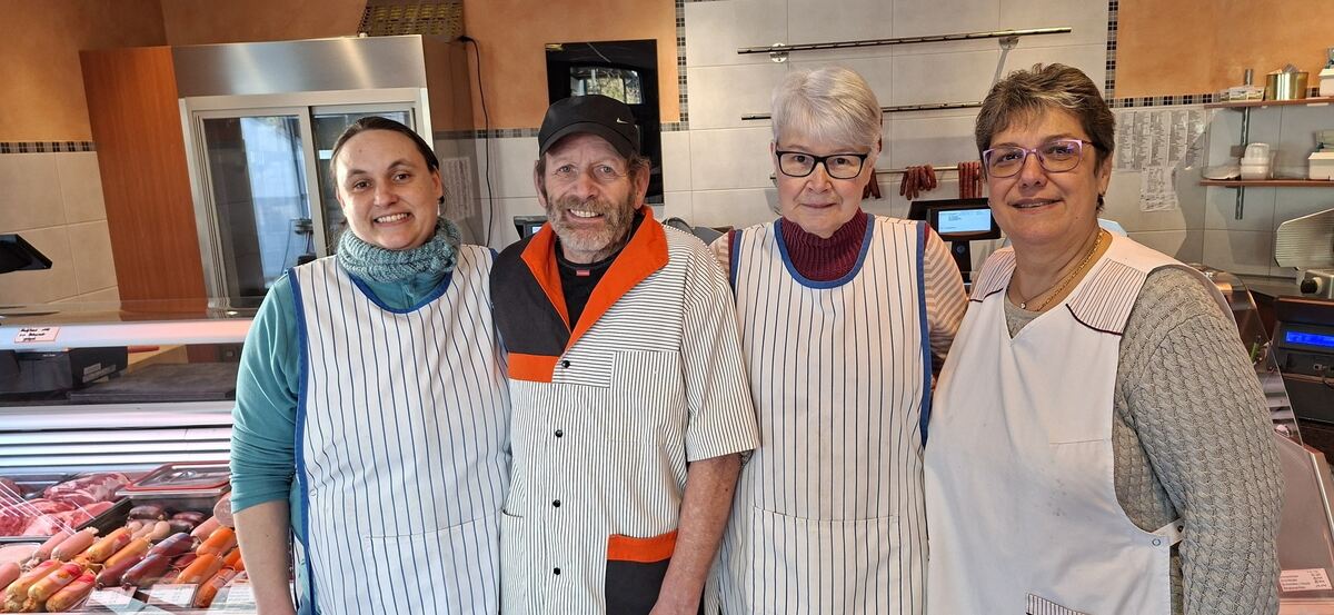 Noch hat die Metzgerei Fritz an vier Tagen pro Woche offen. Im Bild Inhaber Rolf Fritz mit seiner Frau Isolde (Zweite von rechts) und der Mitarbeiterin Christine Hahn (rechts). Links eine weitere Beschäftigte.