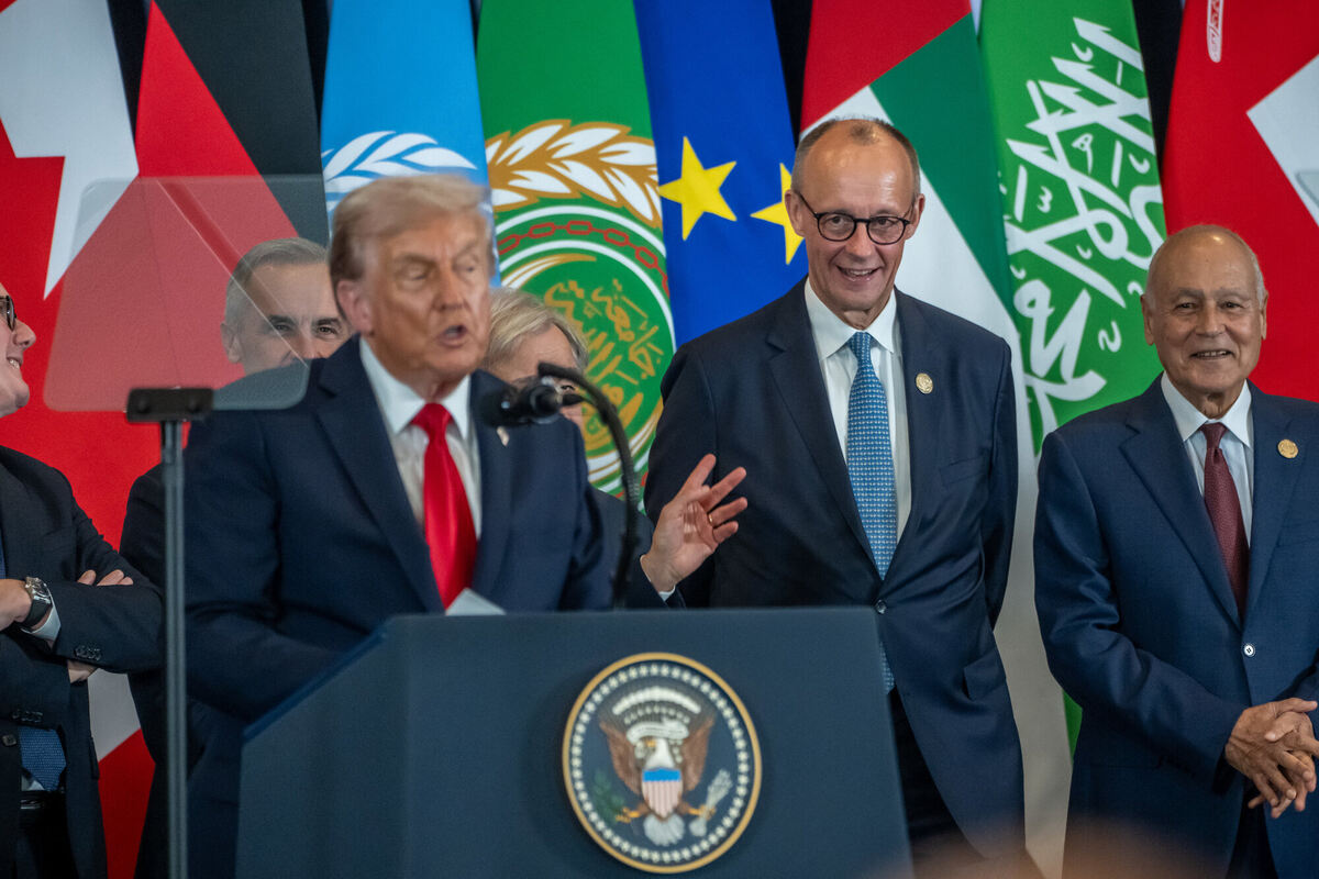 Bundeskanzler Friedrich Merz musste in Scharm El Scheich als Kulisse hinter Donald Trump stehen.