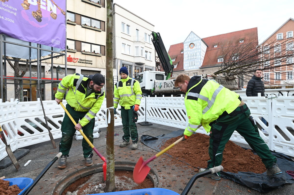 Mit vereinten Kräften setzen Fachleute von Lutz und Riepert einen Ahornbaum in sein Quartier auf dem Marktplatz.
