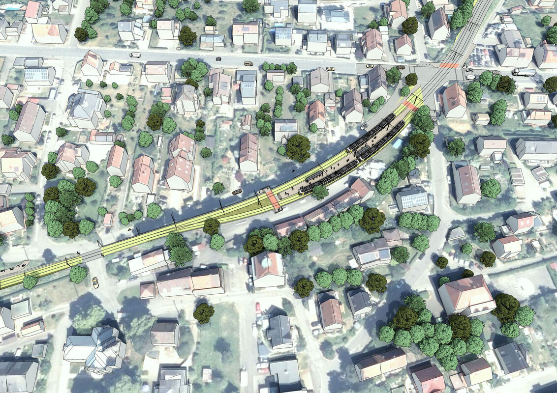 Eine Visualisierung des Zweckverbands zeigt die künftige Haltestelle Ohmenhausen Mitte zwischen der Straßenkreuzung Fehlhaldenweg, Hohe/Neue Straße und dem Bahnübergang Turmstraße.