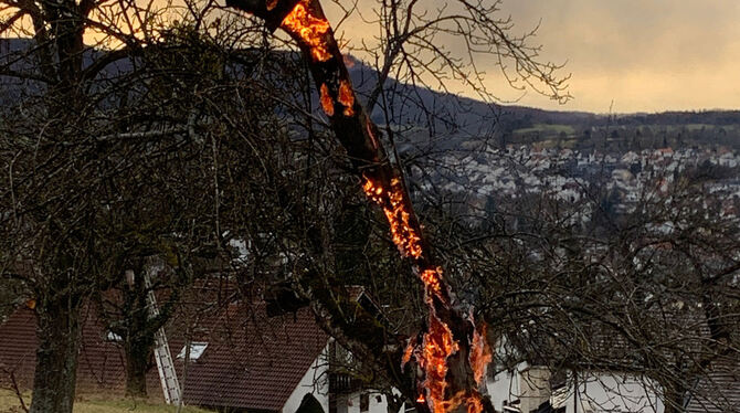 PFULLINGEN. Darüber sind die beiden Jugendlichen offensichtlich selbst erschrocken: Mit den Resten des Silvesterfeuerwerks experimentieren die beiden am Freitagnachmittag an einem altersschwachen Baum oberhalb der Hermann-Hesse-Straße in Pfullingen.