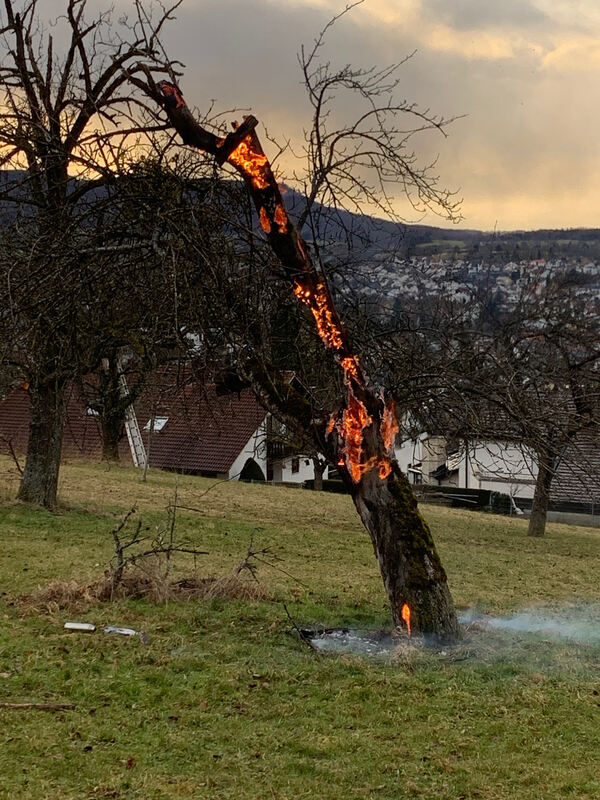 Die Pfullinger Wehr um ihren Kommandanten Dietmar Rall rückte mit zwei Einsatzfahrzeugen aus und erkannte schnell, dass von dem brennenden Baum keine Gefahr ausging. Ein Fahrzeug kehrte folglich gleich ins Feuerwehrhaus zurück. Die Mannschaft des anderen hatte die Flammen zügig im Griff. Auch die Polizei war vor Ort. Sie ermittelt gegen die Jugendlichen wegen fahrlässiger Brandstiftung und übergab diese unverletzt an ihre Eltern. Angesichts des Alters und des Zustands des Baums wird sich der Schaden der Zündelei in Grenzen halten. (GEA)