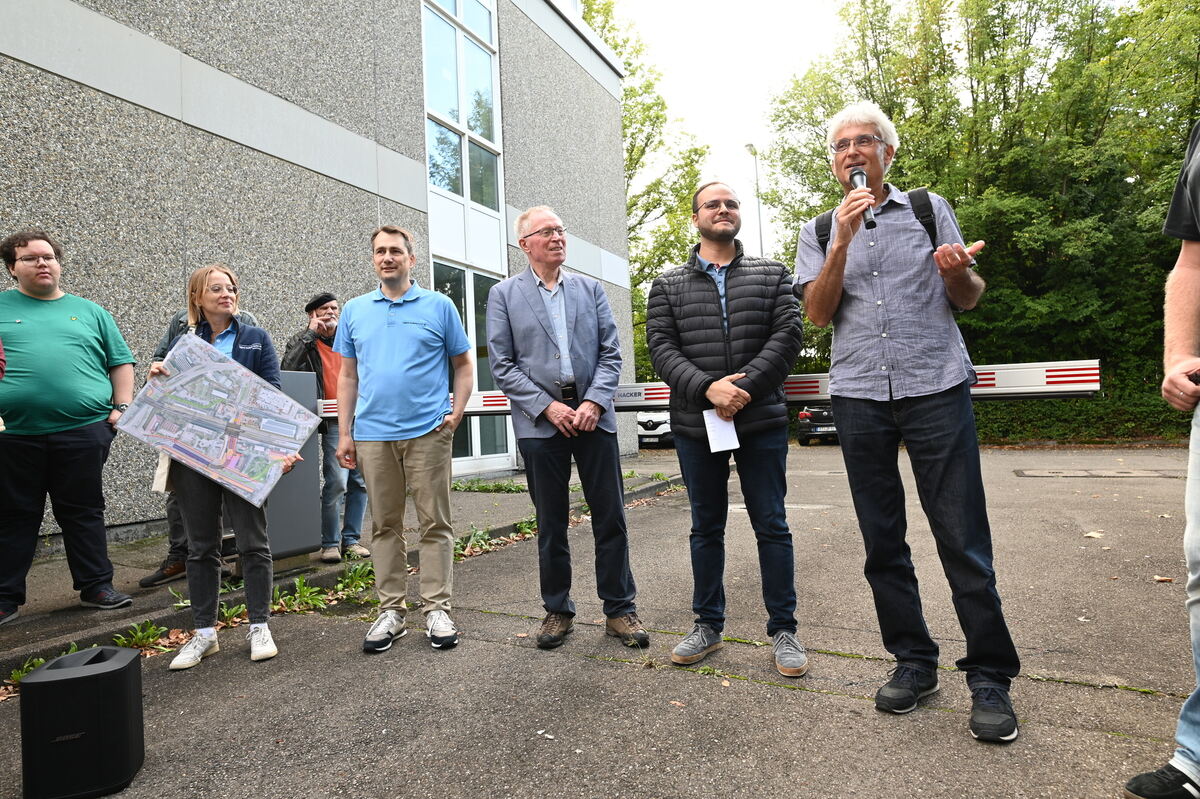 Fahren alle gemeinsam auf die Bahn ab (von links): Mit Karte Lena Hönes neben Geschäftsführer Professor Dr. Tobias Bernecker vom Zweckverband Regional-Stadtbahn Neckar-Alb, die Sozialdemokraten Helmut Treutlein und Mert Akkeceli sowie Stadtplaner Stefan Dvorak.