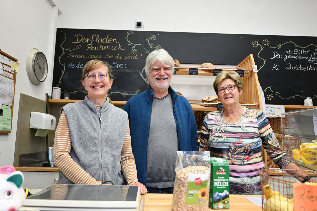 Willi Igel mit zwei Mitarbeiterinnen des Dorfladens: Mini-Jobberin Simone Fink (links) und Margret Walser, eine von fast 50 Ehrenamtlichen.