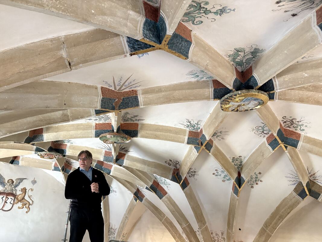 Auch im Inneren wird nun wieder fleißig im Chorraum gearbeitet. Die Fresken an der Decke werden gereinigt, darunter auch die noch gut erhaltenen Gewölbeschlusssteine. Gleichzeitig müssen unbedingt die Grundmauern im Chor stabilisiert, der Innenputz saniert und der Chorboden mit Waldenbucher Sandstein verlegt werden. Hier wurden bereits Leerrohre für die spätere Medientechnik eingezogen, um die Kirche für ihre vorgesehene kulturelle Nutzung vorzubereiten. Geplant war laut Dieter Schmid auch ein barrierefreier Zugang, die Erneuerung der Eingangstüren, die Sanierung des Außenputzes, ein Anstrich für das Kirchenschiffs im Inneren sowie ein neuer, mobiler Altar aus Holz. Ob diese Maßnahmen jetzt jedoch umgesetzt werden können, ist fraglich. »Wir fahren auf Sicht und machen es von den Finanzen abhängig. Wenn nicht genügend Geld da ist, üben wir uns in Verzicht.«
