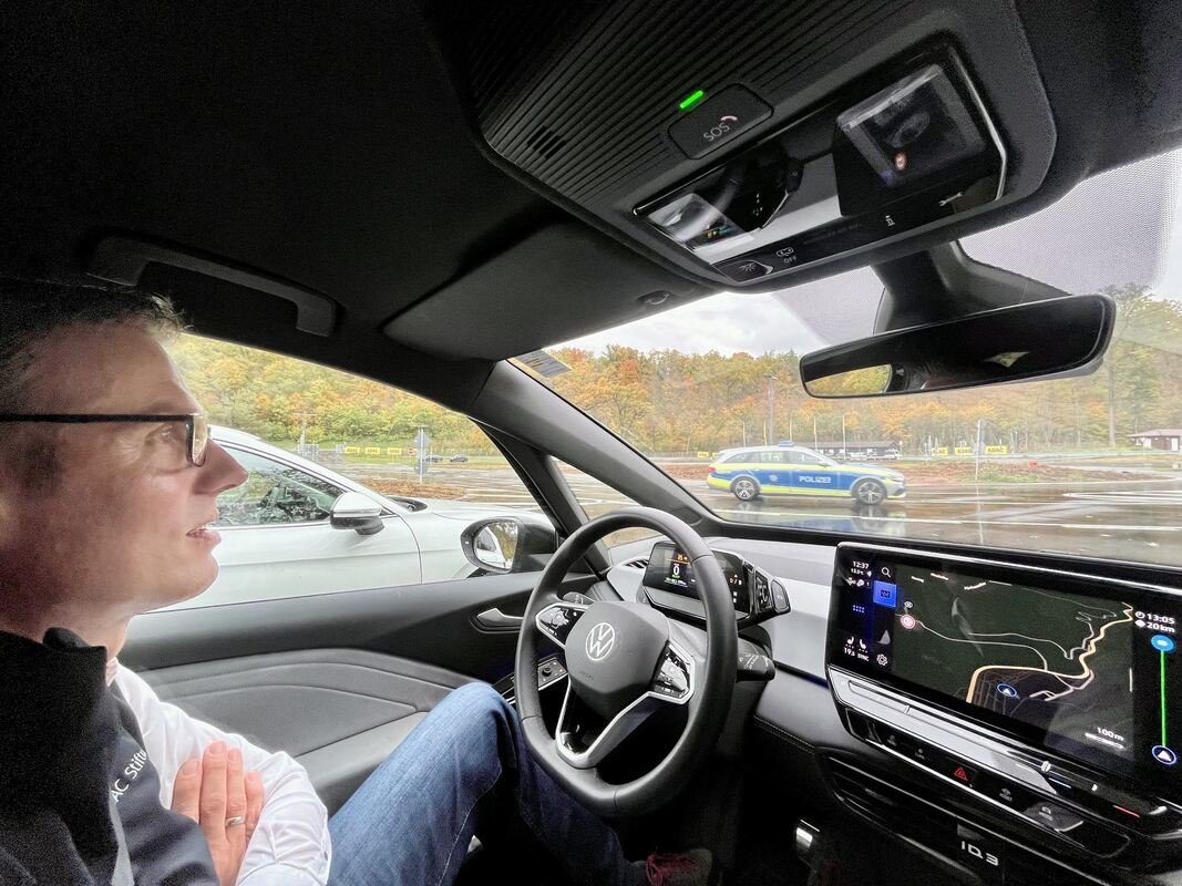 Testfahrer Thomas Heinrich ist gewarnt und stoppt seinen Wagen trotz Vorfahrt vor der Kreuzung. Das Polizeiauto bekommt kurzfristig grünes Licht an der Ampel freigeschaltet.