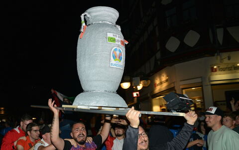 Auf beiden Seiten der Karlstraße und auf der Mittelinsel war rasch fast kein Durchkommen mehr, so dicht gedrängt feierten die Fans fröhlich – bengalische Feuer waren zunächst keine zu sehen, nur vereinzelte Böllerschüsse zu hören. Unter den Anhängern, die Italien-Flaggen in allen Größen schwenkten, stachen vier Männer besonders heraus. Sie hatten eine übergroße EM-Trophäe gebastelt und trugen sie auf einer Sänfte durch die feiernde Menge – immer begleitet von zahlreichen Smartphone-Filmern.
