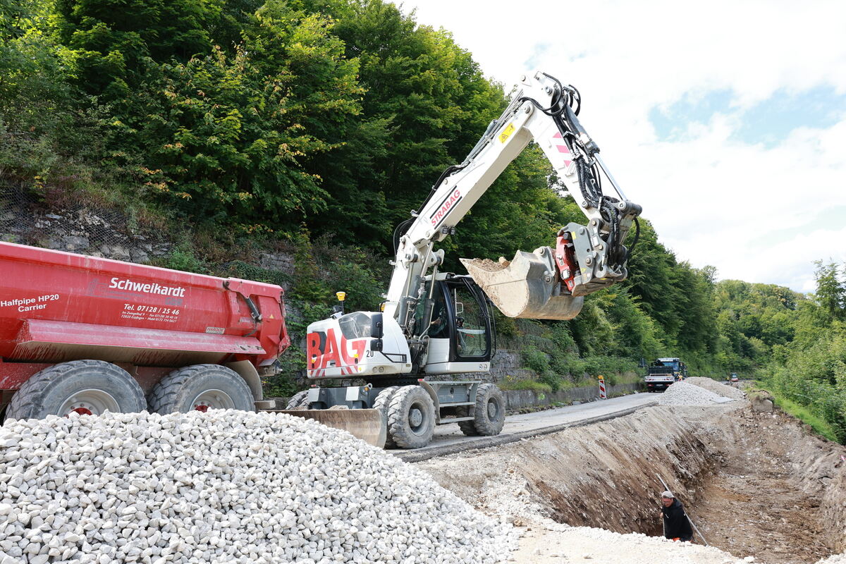 Die Fahrbahnsanierung ist aufwändig: Für die Geowaben muss an verschiedenen Abschnitten ein drei Meter tiefer Graben gebuddelt werden, um den Hang zu sichern.