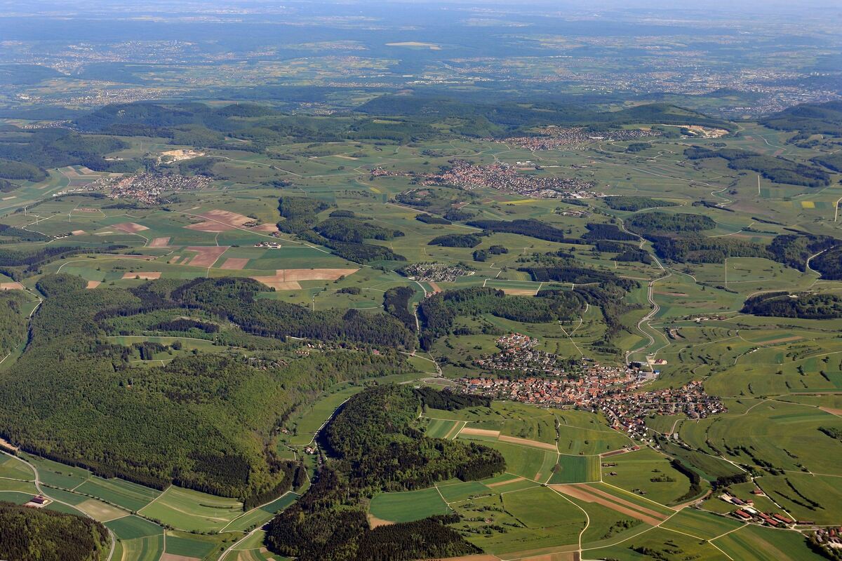Sonnenbühl von oben: links oben liegt Willmandingen, halbrechts oben Undingen und Genkingen, halbrechts unten Erpfingen. Auch abgelegene Gebiete der um die 7.000 Einwohner zählenden Gemeinde können jetzt mit schnellem Internet versorgt werden.