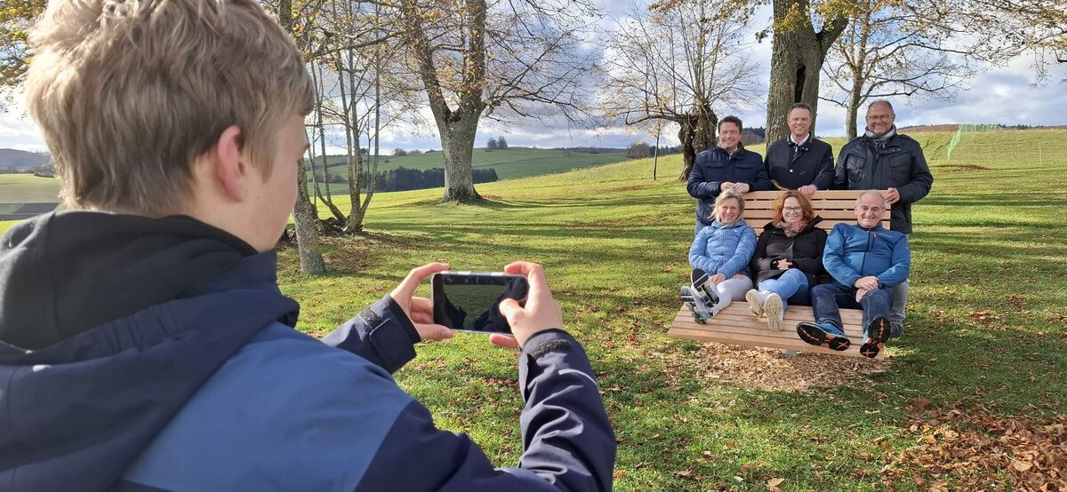 Probesitzen: Tourismusverein, Ortsvorsteher, Bürgermeister und Tourismuschefin testen die vier Himmelsliegen an schönen Aussichtspunkten in allen Sonnenbühler Ortsteilen, hier in Undingen.