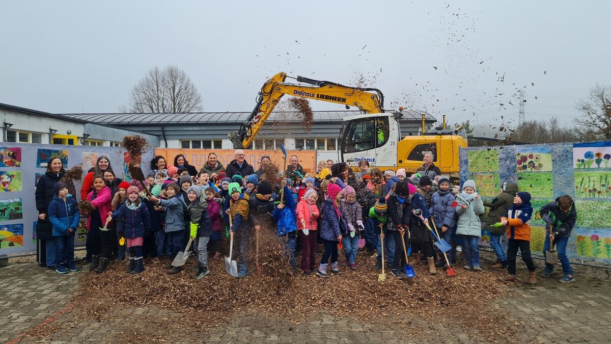 Beim Spatenstich durften alle Kinder der Sternbergschule mitmachen.