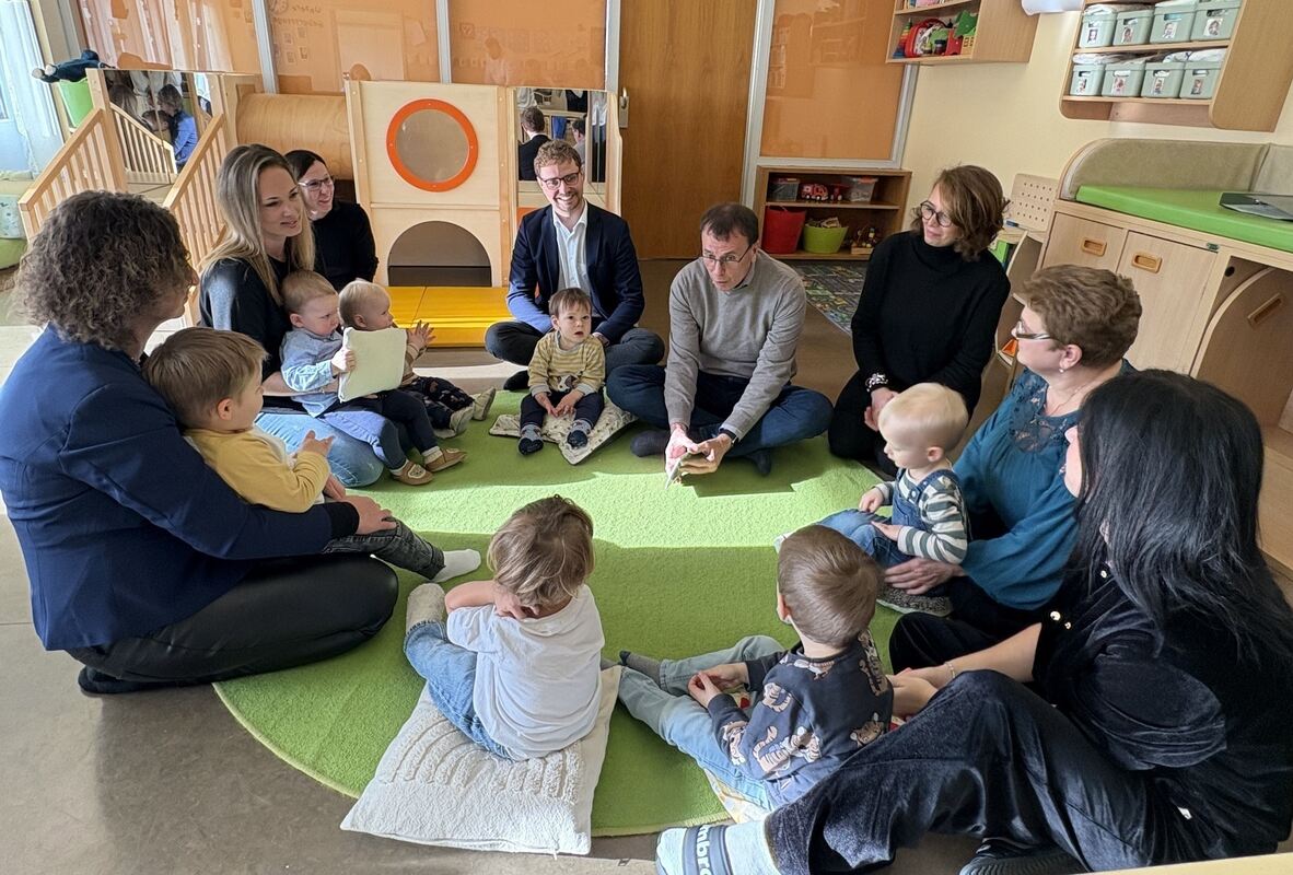 Bürgermeister Simon Baier (Mitte) und Staatssekretär Volker Schebesta (links daneben) sind ins TigeR-Nestle nach Ödenwaldstetten gekommen, um zum 15-jährigen Bestehen zu gratulieren und vorzulesen.