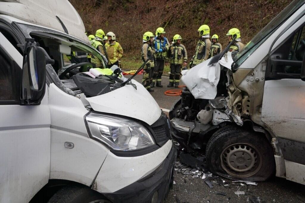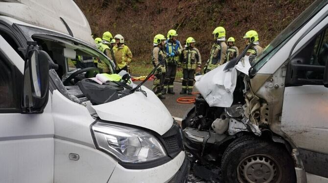 Ein Transporter aus dem Landkreis Reutlingen, mit zwei Personen besetzt, war von Münsingen bergab Richtung Seeburg unterwegs. Auf der serpentinenreichen Strecke kam der Fahrer des Mercedes-Benz Sprinters in einer Rechtskurve »aus noch ungeklärter Ursache« auf die Gegenfahrbahn und stieß mit einem Transporter aus Rumänien zusammen.