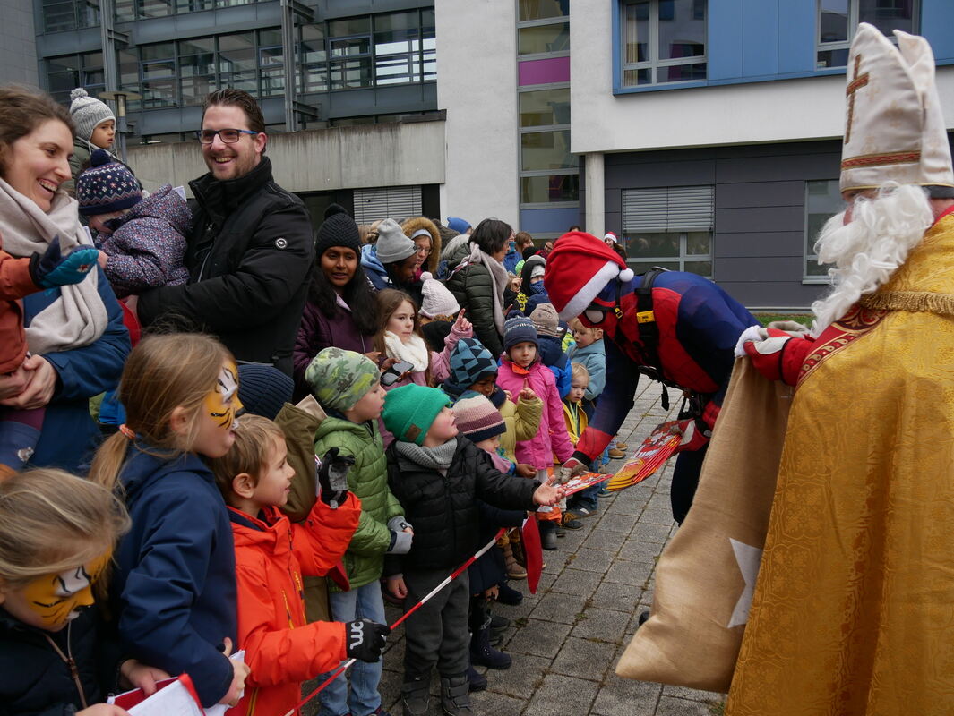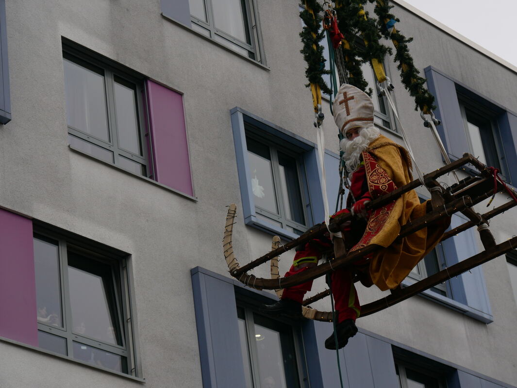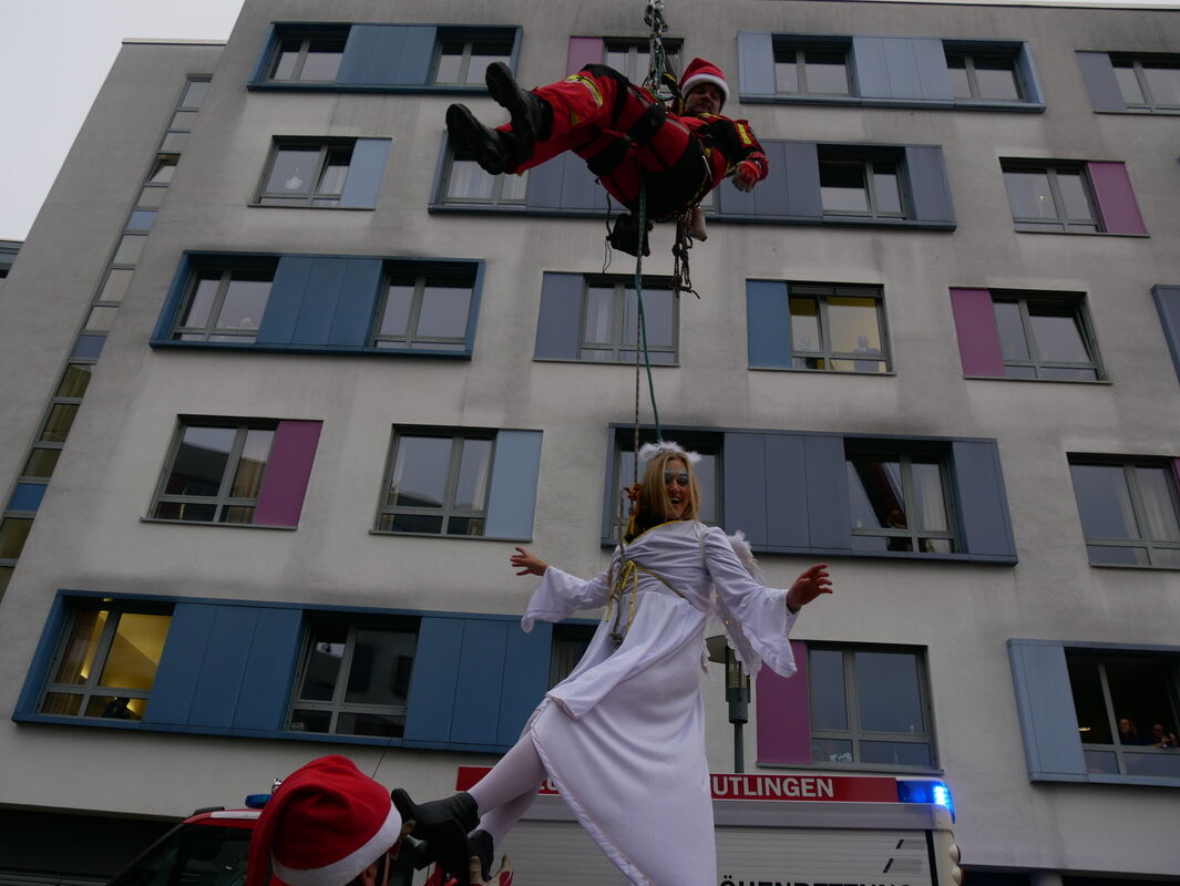 Wer nicht genau hinsah, erkannte auch nicht, dass der Schlitten an einem Stahlseil hing, das wiederum an einem riesigen Kran der Reutlinger Feuerwehr befestigt war. Während Spiderman und der Nikolaus schon damit begannen, am Boden Geschenke an die Kinder der mehr als 150 anwesenden Schaulustigen zu verteilen, schwebte noch ein Engel herbei: Niemand andere als die Chefärztin der Kinderklinik persönlich verbarg sich hinter diesem Rauschgoldengel.
