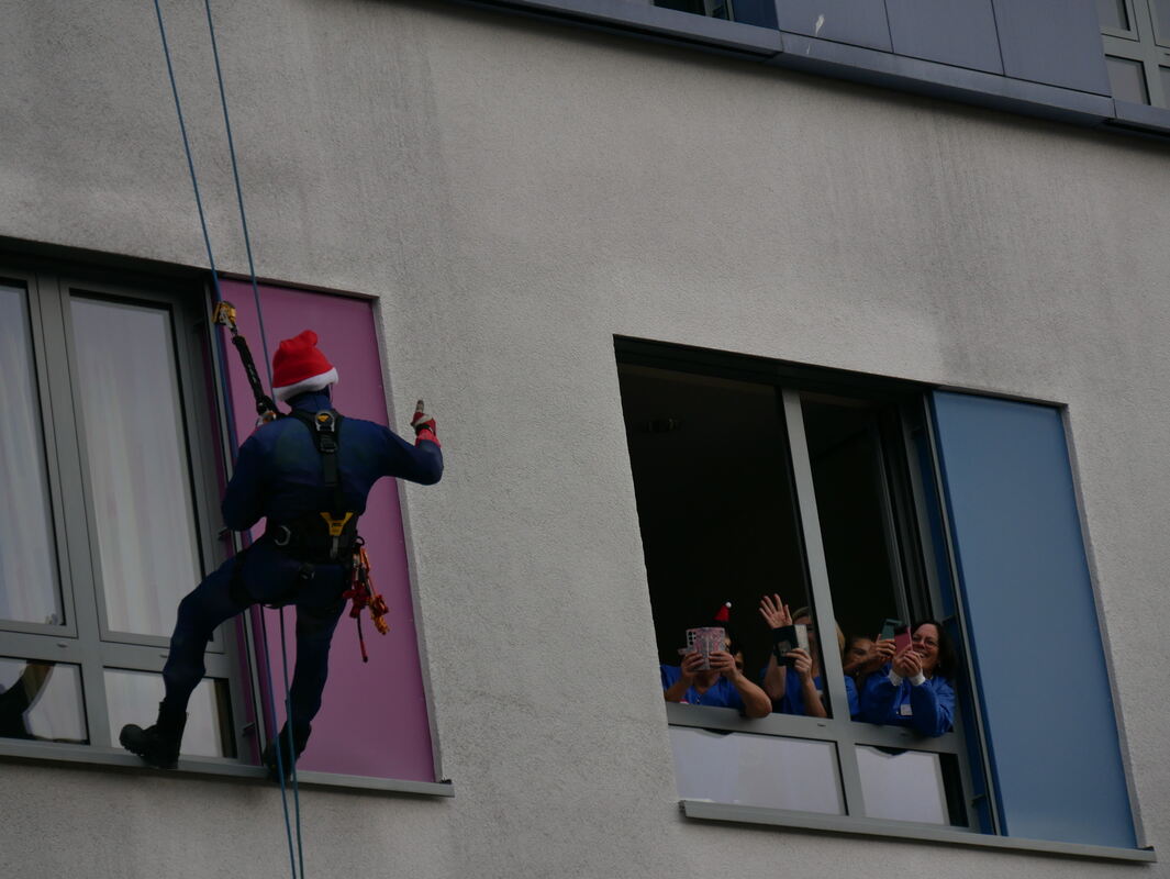 REUTLINGEN. »Vom Himmel hoch da komm ich her« – dieses Weihnachtslied wurde am vergangenen Samstag Realität, als Spiderman (Sven Wenzelburger) leibhaftig an der Wand der Reutlinger Kinderklinik hinunterkletterte und die Kinder hinter den Fenstern der Klinikzimmer begeisterte. Doch damit nicht genug: Anschließend schwebte der Nikolaus (Jochen Maier) auf seinem Schlitten (ohne Rentiere) vom Dach der Klinik an den Fenstern vorbei.