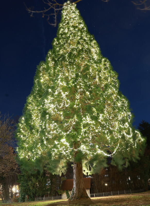 PFULLINGEN. Wow, der hat was! Strahlend schön präsentiert sich in der Vorweihnachtszeit der Mammutbaum im Pfullinger Schlösslespark. Die Idee, den Baum zur Adventszeit zu beleuchten, entstand bei der Sommertour von Bürgermeister Stefan Wörner. Im Rahmen seines Besuchs beim städtischen Bauhof begleitete er eine sogenannte Baumkontrolle im Schlösslespark, die auch den Mammutbaum in Augenschein nahm.