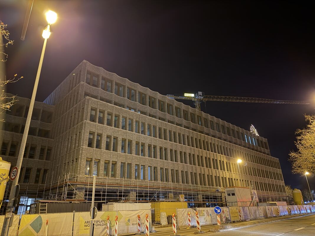 Richtig beobachtet habe der Leser. Es könne durchaus sein, dass hier und da im künftigen Amt, in dem rund 1.000 Mitarbeitende beschäftigt sein werden, keine Dunkelheit herrscht, obschon noch niemand dort in den Büroräumen seinen Geschäften nachgeht. Es sei denn, es handelt sich um Handwerker, Bauarbeiter, Technikexperten. »In den Treppenhäusern haben wir eine Art Notbeleuchtung. Es kann immer mal jemand drin sein«, erklärt Hugger. »Die brennt aber nur, wenn's dunkel ist.« Es handele sich dabei um stromsparende Lichterketten. Sicherheit geht eben vor.