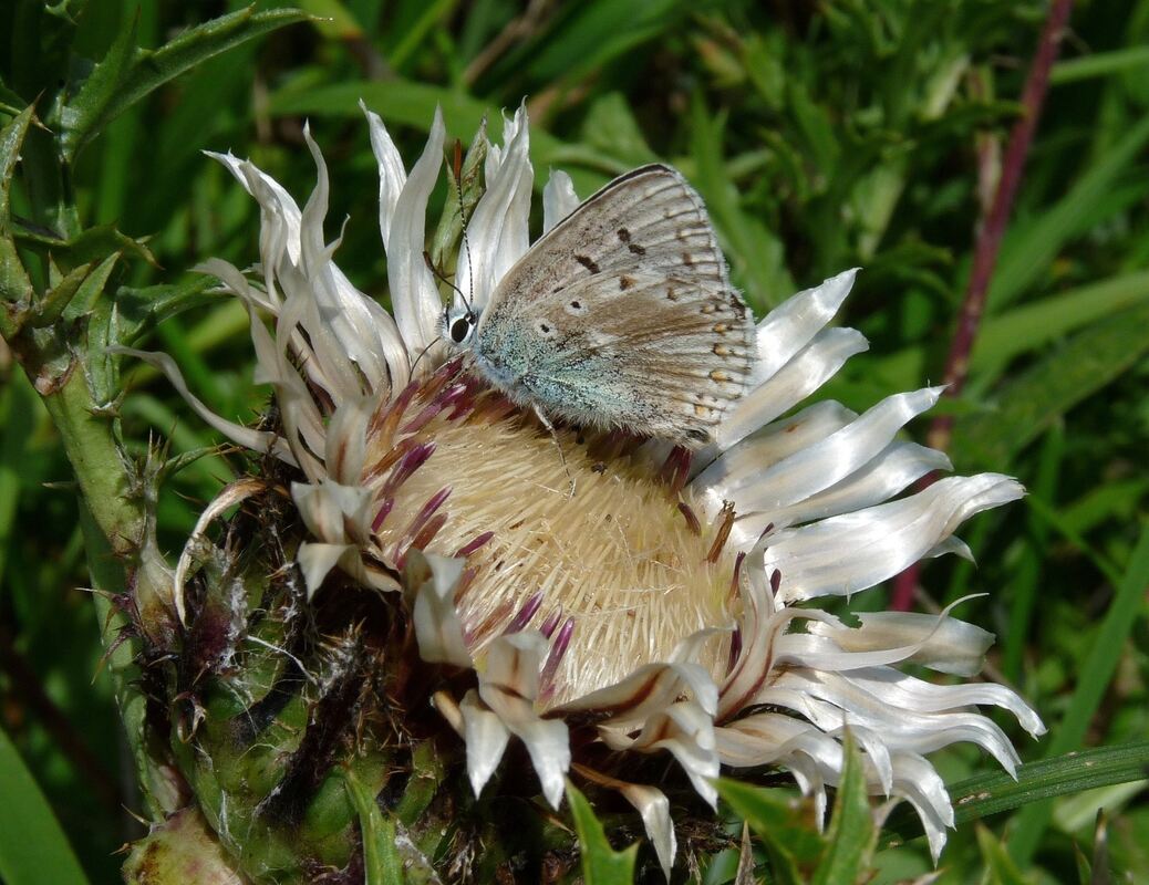 Sie ist die Charakterpflanze der Wacholderheiden. Wie kleine, strahlende Sonnen leuchten sie dem Albwanderer entgegen. Sie zeigen den Spätsommer und den Frühherbst an. Die Große Eberwurz, wie sie auch genannt wird, ist ein Korbblütengewächs. Die eigentliche Blüte besteht aus vielen kleinen, zwittrigen Röhrenblüten im Zentrum des Strahlenkranzes. Die silberweißen Strahlen sind lediglich die Hüllblätter für das Körbchen in der Mitte und Namen gebend.