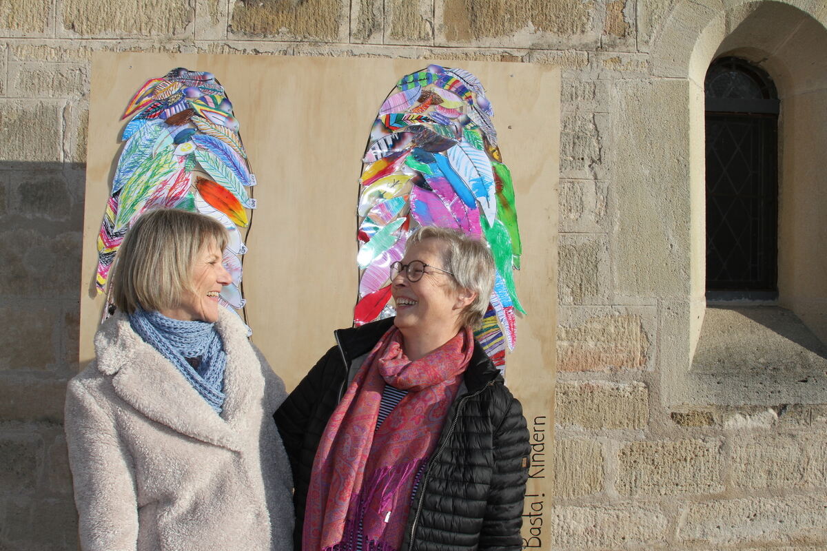 Sabine Rist (rechts) und Suse Lutz haben das »Global Angel Wings Project« nach Wannweil gebracht. Hier stehen sie vor der Johanneskriche in der Ortsmitte.