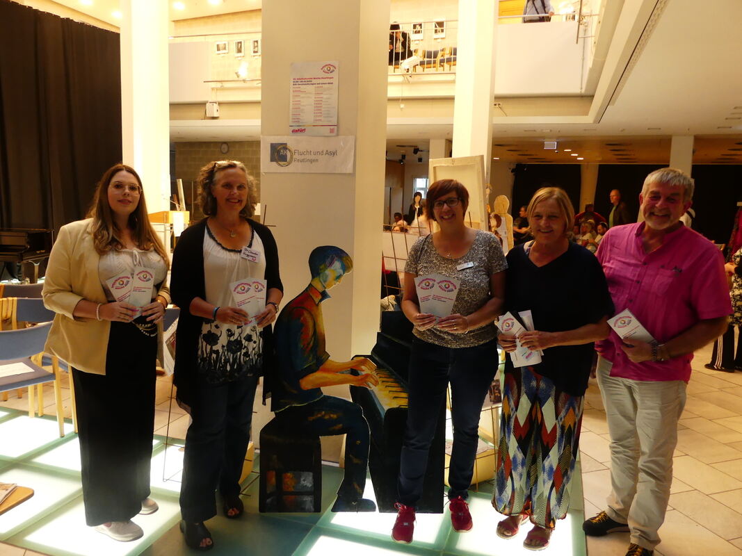 Anna-Katharina Sonnemann (Asyldiakonat des Diakonieverbandes Reutlingen), Dr. Claudia Guggemos (Katholische Erwachsenenbildung), Irene Karki (Volkshochschule Reutlingen), Sigrid Kulik (Caritas-Zentrum Reutlingen) und Clemens Dietz (Katholisches Dekanat Reutlingen-Zwiefalten) stehen neben dem Kunstwerk, das den »Trümmer-Pianisten« darstellen soll. Drei Wochen Programm haben die Organisatoren geplant.
