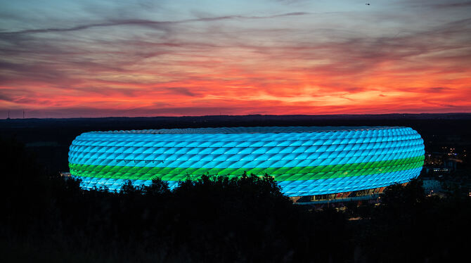 Das Stadion ist in den Farben türkis und grün beleuchtet.