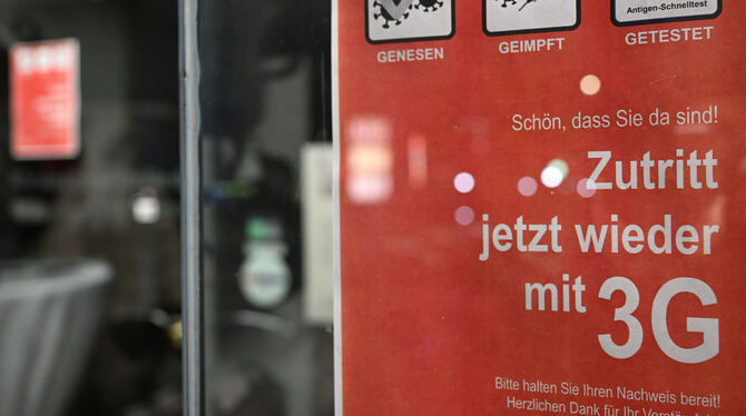Ein Hinweisschild mit Zutrittsregeln hängt an der Tür eines Ladens in der Innenstadt. Nach den neuen Regeln können Ungeimpfte wieder mit einem aktuellen Test shoppen gehen.
