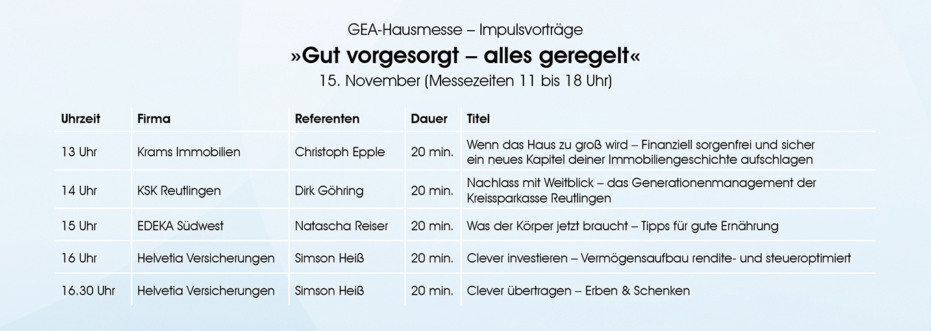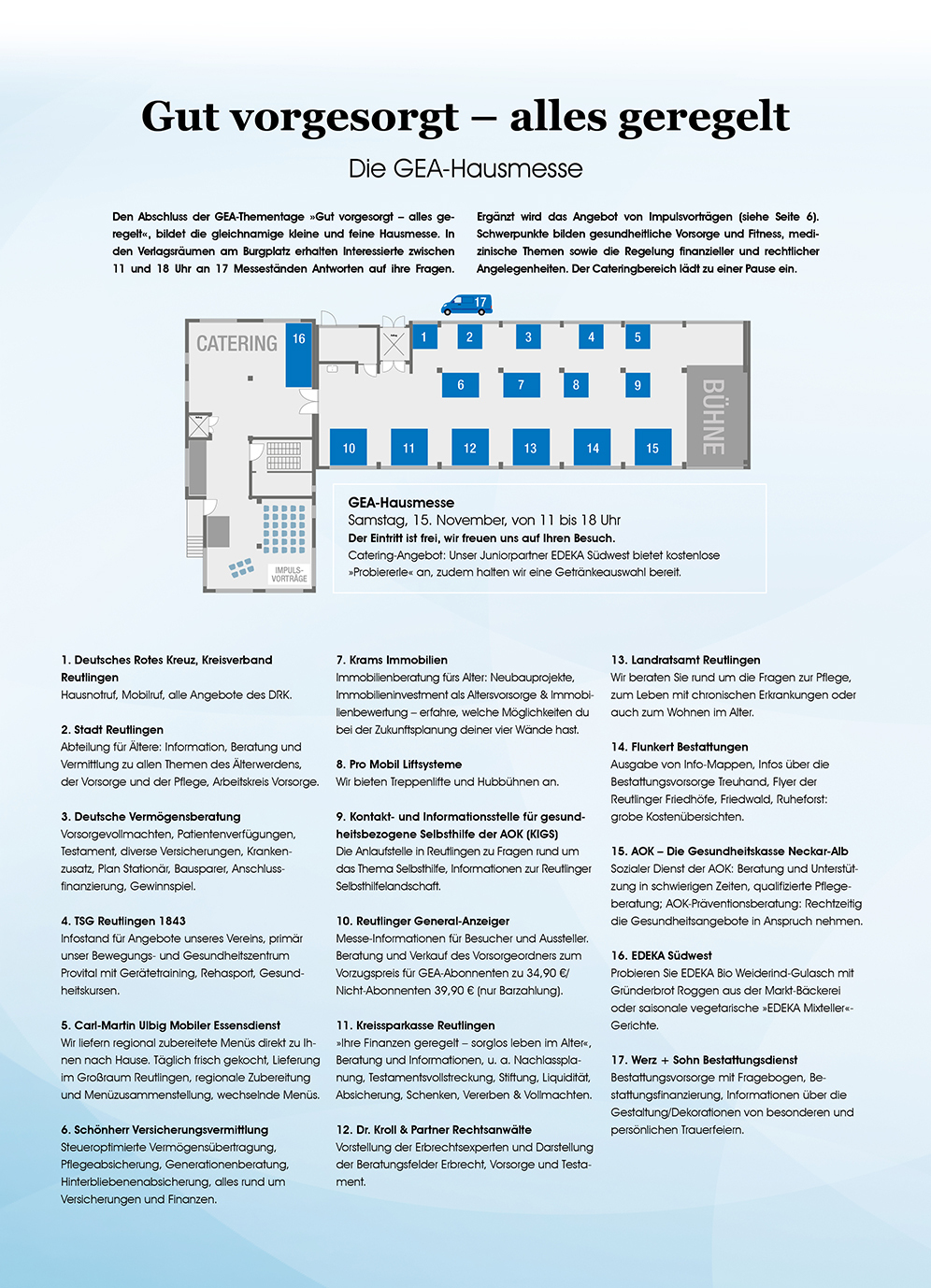 Die Aussteller bilden unter anderem folgendes Spektrum ab: Sozialer Dienst, Selbsthilfe-, Pflege- und Gesundheitsthemen, Bewegungsangebote, Ernährungstipps mit kostenlosen »Probiererle«, Liftsysteme, Versicherungen, Finanz- und Immobiliendienstleistungen, Erbrechtsthemen, Wohnen im Alter und Bestattungsvorsorge. Fünf Impulsvorträge ergänzen das Messeangebot.